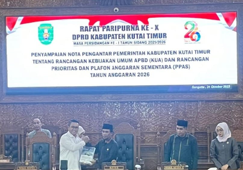 INFO FKDM KUTIM – Pemerintah Kabupaten Kutai Timur (Kutim) telah menyampaikan Nota Pengantar Rancangan Kebijakan Umum APBD (KUA) dan Rancangan Prioritas dan Plafon Anggaran Sementara (PPAS) Tahun Anggaran 2026 dalam Rapat Paripurna DPRD Kutim, Jumat (31/10/2025).
